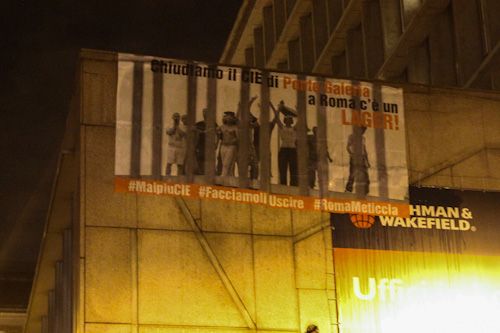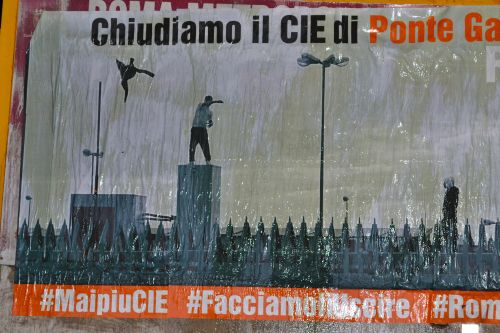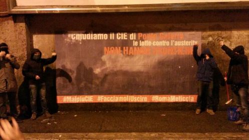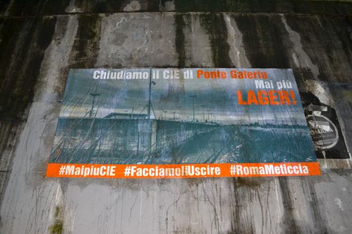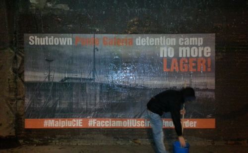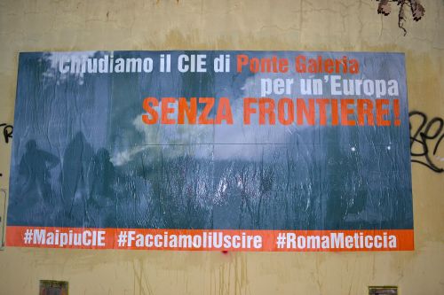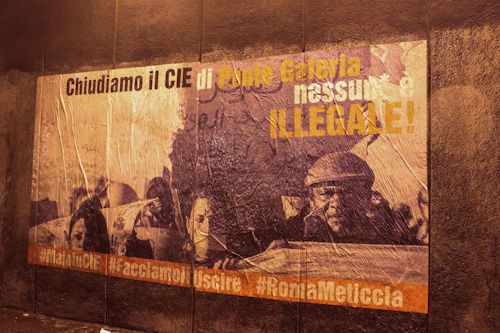 Shortly after midnight on March 1, the day of the rights of migrant workers, have appeared on the walls of Rome 9 huge posters claiming the closure of the CIE of Ponte Galeria and all detention centres for migrants. From Kant street to Cristoforo Colombo street, from La Spezia street to Scalo San Lorenzo, from Porta Maggiore to Prenestina street the walls of the mestizo city shout NO MORE CIE. This action is direct cotninuity with the demonstration of thousands of people that on the 15th of February protested in front of the concentration camp of Rome-Ponte Galeria and attacked the perimeter fences.