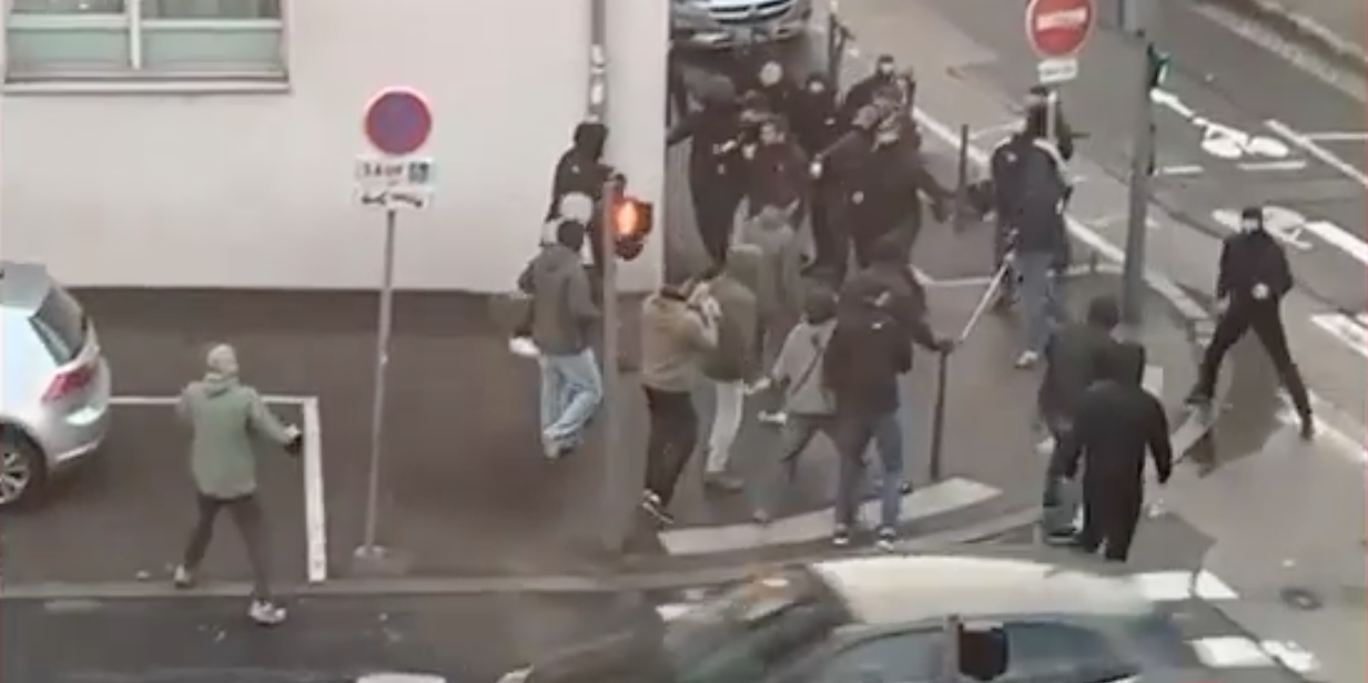 Il filmato mostra un gruppo di estrema destra con una torcia infiammabile – lanciata contro gli antifascisti con l’intenzione di ustionarli gravemente, come ci ha spiegato il nostro testimone – oltre a spranghe di ferro ed elmetti. Le Canard scrive: “Alcuni erano dotati di guanti tirapugni. Uno di loro colpisce i suoi avversari con un casco da motociclista, un altro usa una stampella e lo spray al peperoncino. Un terzo usa un ombrello”.