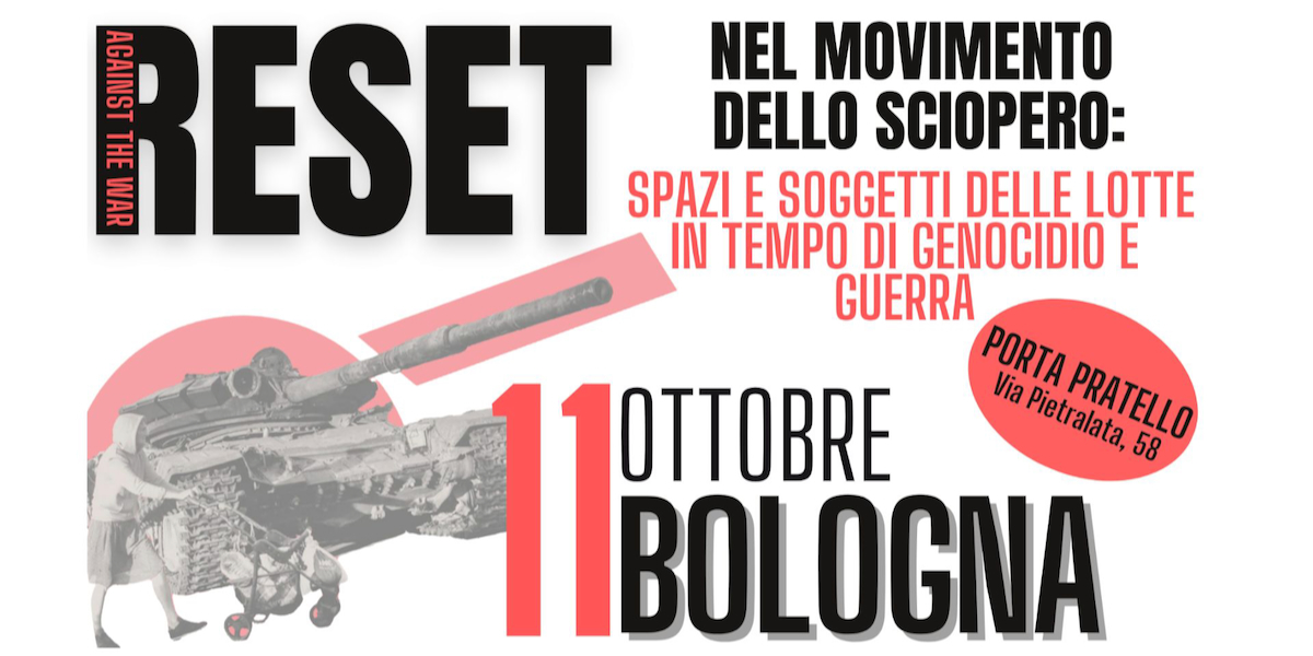Dopo i blocchi del 22 settembre e 3 ottobre e il grande corteo del 4 a Roma, la rete RESET Against the War propone una giornata di assemblea l’11 ottobre a Bologna. Il programma della giornata