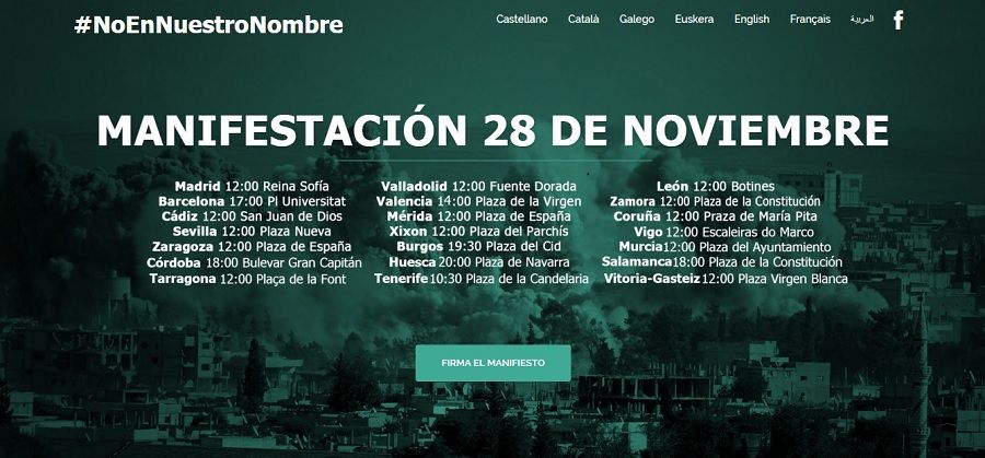 Come firmatarie e firmatari di questo manifesto crediamo che la democrazia, i diritti umani e l’aspirazione a una pace con giustizia non sono né una meta né una moneta di scambio per niente, piuttosto che costituiscono in sé stessi il cammino e l’orizzonte, oltre che la migliore risposta contro chi vuole farla finita con essi. Per questo ci opponiamo drasticamente a qualsiasi risposta all’odio che implichi più odio, più intolleranza, più morti di innocenti e meno diritti e libertà. Dalla convinzione che in questi momenti la cittadinanza non solo non può nascondersi, ma deve essere protagonista ed in prima linea ad indicare la risposta contro il terrore, ci convochiamo il Sabato 28 di Novembre alle 12:00 nella piazza del Museo Reina Sofia per mostrare la nostra condanna agli attacchi terroristici di Parigi e Libano, la nostra condanna ai bombardamenti contro la popolazione civile siriana, la nostra condanna ai tagli alla democrazia come inefficaci garanzie di sicurezza e la nostra condanna alla politica estera guerrafondaia iniziata da Bush-Blair-Aznar. Invitiamo il resto dei municipi ad aggiungersi a questa iniziativa realizzando convocazioni cittadine simili. Contro il terrorismo, contro l’islamofobia e contro le loro guerre. Né le restrizioni delle libertà né i bombardamenti ci porteranno la sicurezza e la pace. NON in nostro nome.