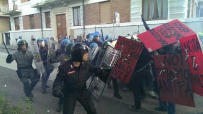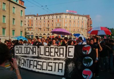 BOLOGNA. Una giornata di mobilitazione lunghissima a Bologna, che nello stesso giorno vedeva il governatore della Banca d’Italia Ignazio Visco nell’aula magna di Santa Lucia, invitato da il Mulino ha tenere una lettura, e una manifestazione di Forza Nuova dopo la cacciata delle sentinelle dalla piazza la scorsa settimana. Una giornata di lotta contro l’austerità e ogni forma di fascismo e omofobia. Prima il corteo si è diretto a contestare Visco, la testa del corteo si è allora confrontata con la polizia lanciando uova e vernice. Le forze dell’ordine hanno reagito con una violenta carica di fronte alla quale il corteo ha resistito, difendendo con il lancio di oggetti e petardi. La manifestazione ha continuato il suo percorso per andare a contestare la presenza di Forza Nuova e del suo segretario Roberto Fiore in città: anche qui solito copione con le forze dell’ordine che caricano gli antifascisti garantendo la piazza a razzisti e omofoni. Il corteo si è sciolto dopo esserci recato sotto la Questura per pretendere il rilascio di un’attivista fermato durante la contestazione a Forza Nuova.