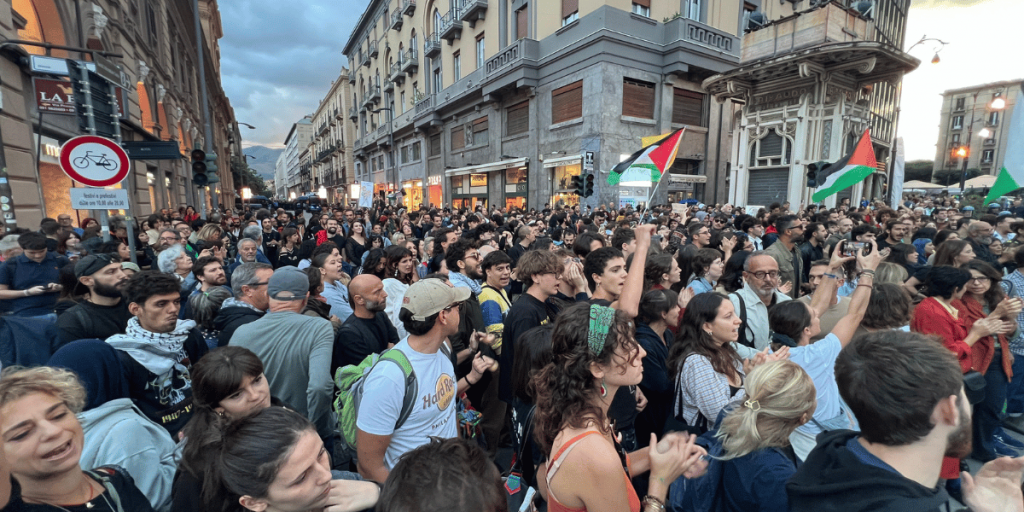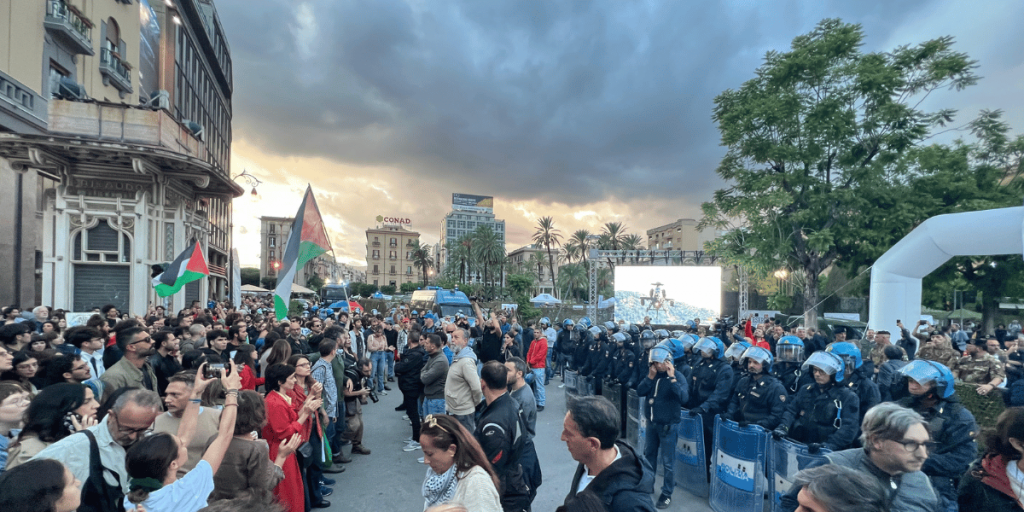 Il 1° ottobre, un corteo partito da piazza Sant’Anna – nato dal presidio in solidarietà con la Global Sumud Flotilla, iniziativa internazionale in sostegno al popolo palestinese – ha tentato di raggiungere l’area del Politeama per contestare l’allestimento del Villaggio. Il corteo, composto da centinaia di persone, si è trovato di fronte un imponente cordone di forze dell’ordine. Durante i momenti di tensione si sono verificati scontri e una persona è rimasta ferita. Gli e le attiviste hanno denunciato la sproporzionata presenza di polizia e carabinieri, sottolineando come ancora una volta la risposta dello Stato alle voci di dissenso sia stata la repressione.