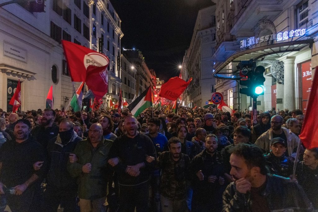 Il centro di Roma si è riempito di migliaia di manifestanti dopo l’arrivo della notizia che la Global Sumud Flotilla veniva aggredita dall’esercito israeliano in acque internazionali. Da piazza dei Cinquecento è partito un corteo denso di persone, e in poche ore ha raccolto una marea che ha invaso le vie intorno a palazzo Chigi, per protestare contro la complicità del governo Meloni con il genocidio in corso a Gaza.